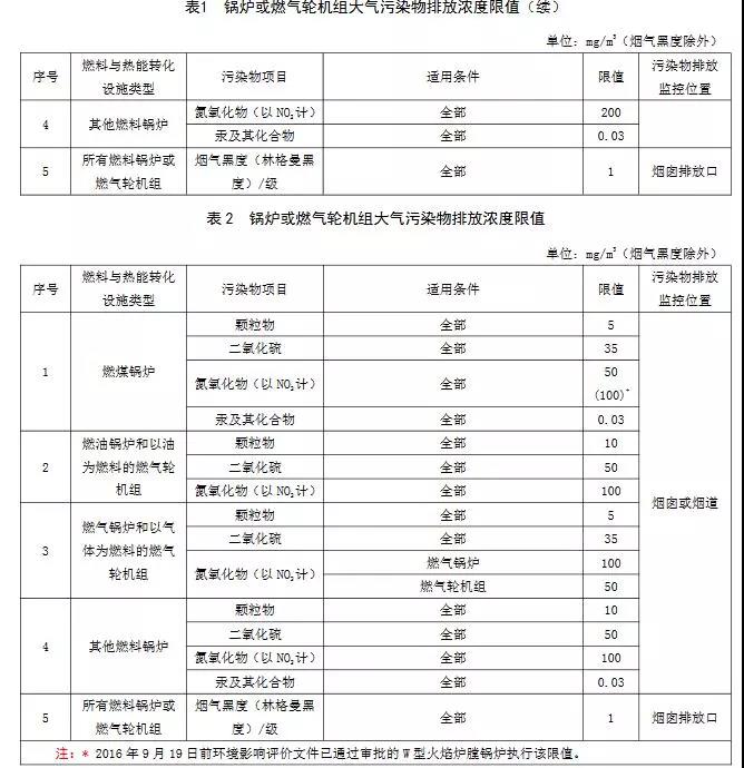 4.22016年9月20日起至本標(biāo)準(zhǔn)實(shí)施之日前環(huán)境影響評(píng)價(jià)文件通過(guò)審批的燃煤鍋爐,2017年1月1日起至本標(biāo)準(zhǔn)實(shí)施之日前環(huán)境影響評(píng)價(jià)文件通過(guò)審批的燃油鍋爐和以油為燃料的燃?xì)廨啓C(jī)組、燃?xì)忮仩t和以氣體為燃料的燃?xì)廨啓C(jī)組以及其他燃料鍋爐,新建鍋爐或燃?xì)廨啓C(jī)組,自本標(biāo)準(zhǔn)實(shí)施之日起執(zhí)行表2中的排放濃度限值。
