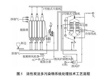 活性炭多污染物協同處理技術由吸附系統、解析系統、輸送系統和硫資源化利用系統組成。煙氣由增壓風機引入吸附塔,氨氣在吸附塔入口加入,SO2、Nox、粉塵、二噁英、重金屬等污染物脫除在吸附塔內完成。吸收了污染物的的活性炭通過輸送系統送往解析塔,在430℃氮氣氣氛下對活性炭進行加熱解析,產生富含SO2氣體,同時可以分解約70%的二噁英,活性炭經篩分后重新利用,篩下物可送往高爐或燒結作為燃料使用,工藝流程如圖5所示。