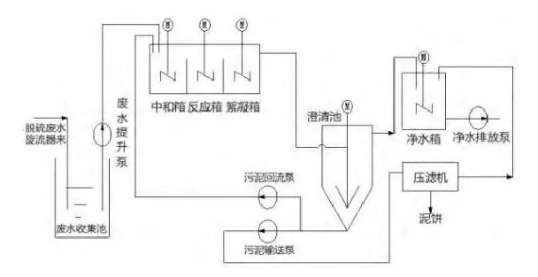(2)將脫硫廢水加藥系統接一路至事故漿液箱,廢水在事故漿液箱內進行中和、凝聚、絮凝。