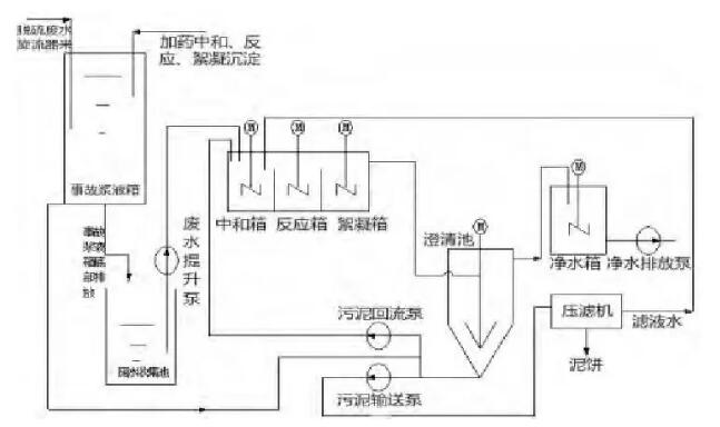 (4)壓濾機的濾液水接至三聯箱,經澄清池再次沉淀*終排出。